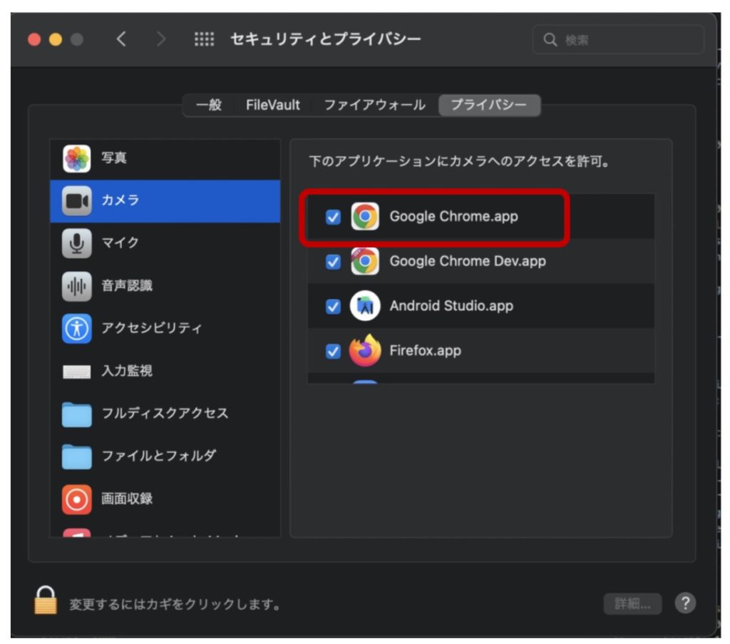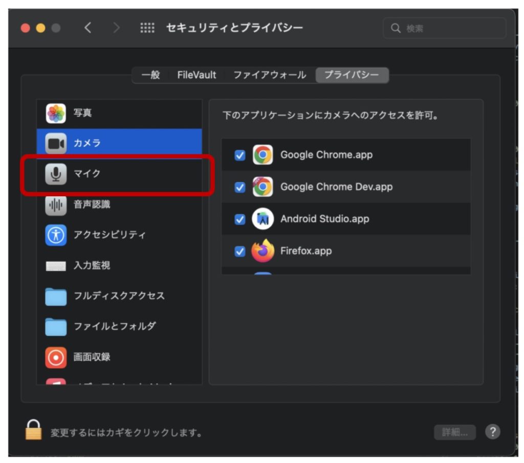 Mac OSで相手に音声が届かないときは、下記の設定をご確認ください。 「システム環境設定」を選択。 「セキュリティとプライバシー」をクリックください。 左のメニューから「マイク」を選択します。 左下の「カギマーク」をクリックします。 「Google chrome」にチェックを入れてください。 « 録画・録音機能 自分の「映像」が相手に映らない場合(Mac OS) »