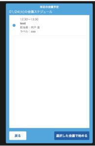 入室した会議ルームの「本日の会議予定」から該当の会議を選択して「選択した会議で始める」で会議が開始されます