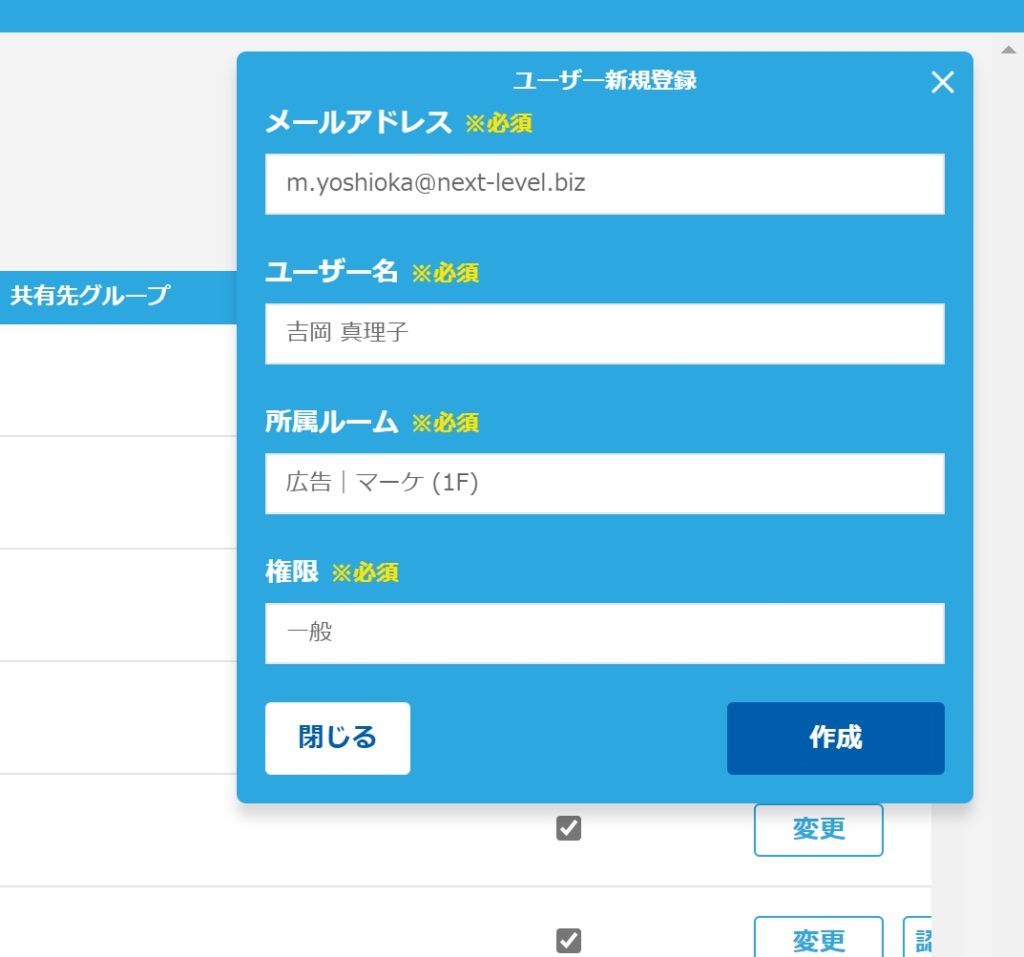 3.「ユーザー新規登録」画面が表示されます。登録内容をご入力のうえ、「作成」ボタンをクリックしてください。