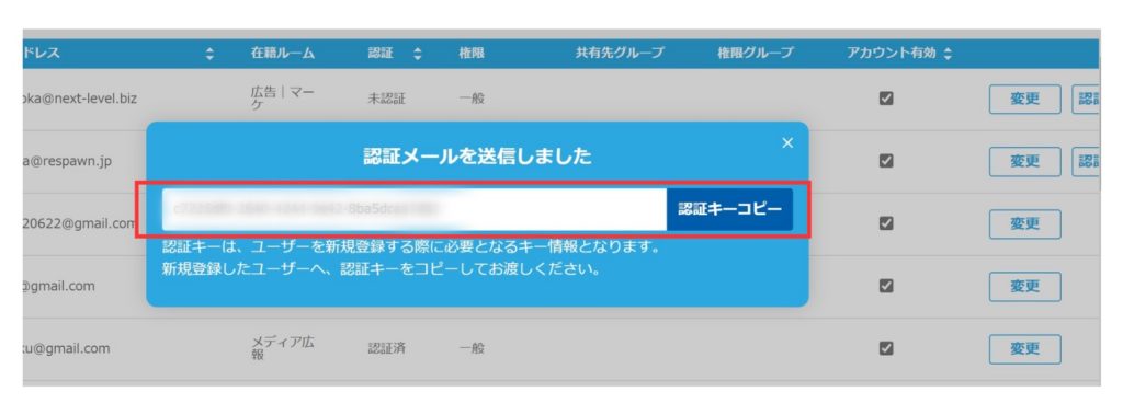 4.新規登録したユーザーに「認証メール」が送信され、画面上で「認証キー」が発行されます。「認証キー」は登録時に必要な情報です。コピーの上、新規ユーザーとなる方にお渡しください。